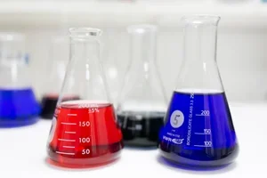 Two laboratory flasks, one with red liquid and the other with blue liquid, placed on a white surface with some additional lab equipment in the background.